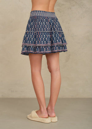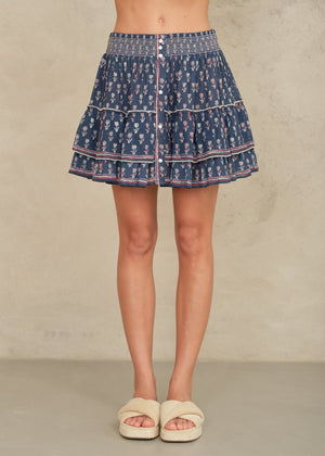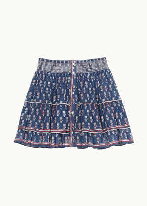 Crafted in a soft cotton, the Ari Mini skirt is patterned in a pretty simple blockprint with striped printed borders. The elasticated waist and tiered silhouette give a flattering free flowing fit. Detailed with buttons at the waist.