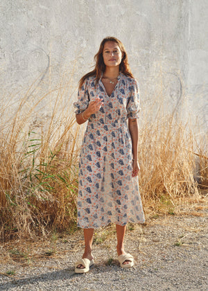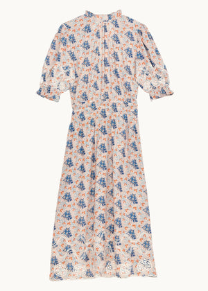 Made from cotton in a delicate floral print the Aster midi dress is detailed with contrast tonal embroidery. The softly elasticated waist gives gentle gathers to the silhouette for a flattering fit. With a frill collar and a tie detail.