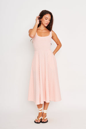 The perfect blend of comfort and style, the Audrey fit and flare tank dress was designed to flatter every figure. The bias-cut midi-length skirt creates a graceful flow, while the textured Pink Ivory stripe knit adds a touch of sophistication. With the added convenience of side pockets, this dress is as practical as it is chic. Ideal for casual outings or dressed-up occasions, this versatile piece will quickly become a staple in your wardrobe.