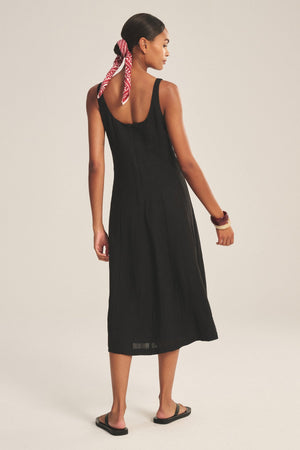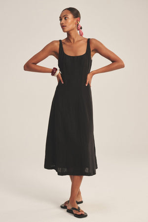 Crafted from breathable woven linen, this midi dress offers a lightweight, comfortable fit with a flattering silhouette. Featuring a square neckline, darting through the bust and waist for a tailored shape, and a zipper-back with clasp closure, it’s fully lined for ease and coverage. It’s a versatile piece perfect for both casual and elevated occasions.