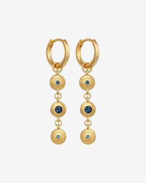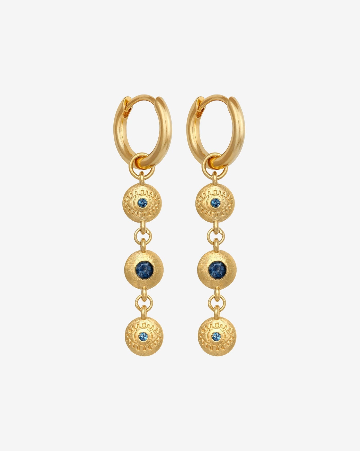 The Blessing Earrings feature a series of cross-brushed, lentil-shaped discs suspended from polished huggie hoops. The mati—or evil eye—motif is carved into the top and bottom discs, a subtle symbol of protection.