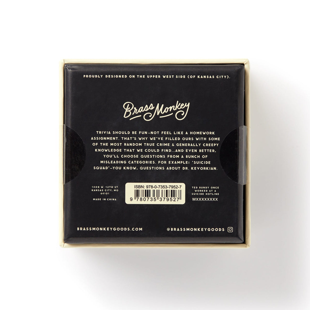 Trivia should be fun–not feel like a homework assignment. That's why this Truly Terrifying Trivia set by Brass Monkey is filled with some of the most random true crime & generally creepy knowledge we could find…and even better, you'll choose your questions from a bunch of misleading categories. For example: 'Suicide Squad.' Those are questions about Dr. Kevorkian, by the way.