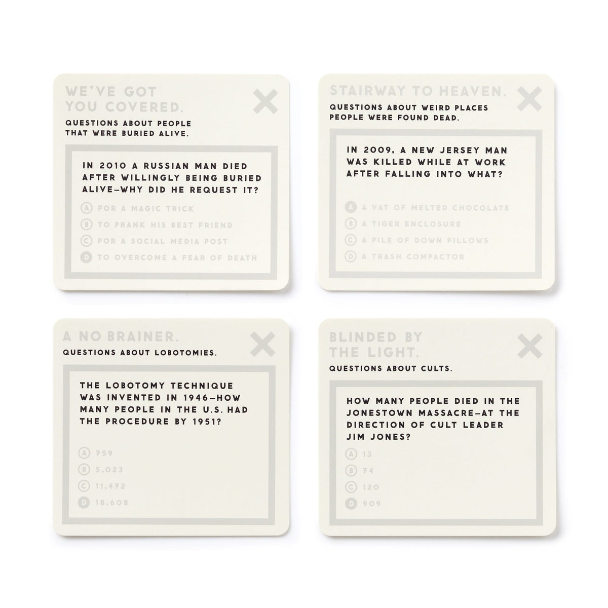 Includes 200 unique trivia cards specifically themed around truly terrifying facts (that you'll probably regret learning).