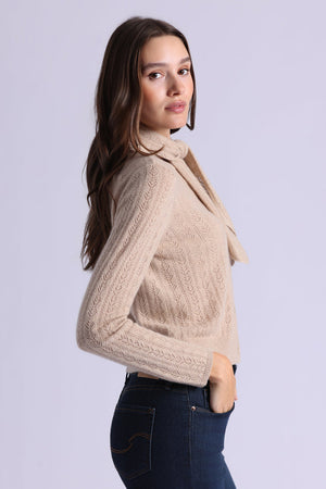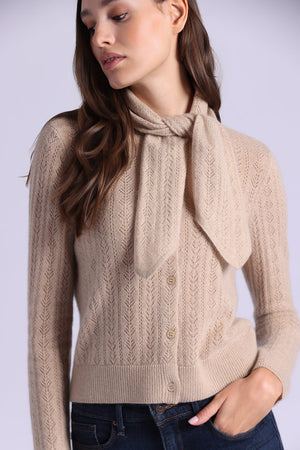 This cardigan pairs soft, lightweight cashmere with intricate pointelle detailing, while the tie-front adds a flattering, modern touch. Effortless to layer or wear alone, it’s the kind of piece that feels chic, cozy, and unmistakably elevated.