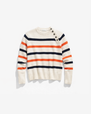 You'll love this sweater from White + Warren not just for it's soft cashmere feel, but for it's classic design that's been elevated. Timeless stripes pop in contrasting orange and navy colors with a sophisticated button detail along the left shoulder.