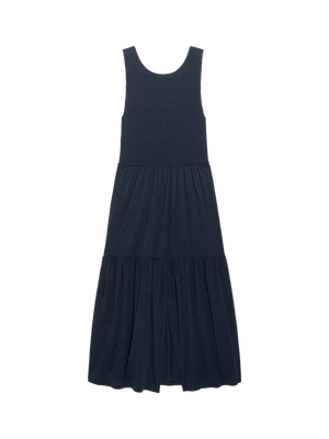 The Clementine Midi Dress is a refined, feminine staple in 100% pima cotton in a form-fitting A-line. A smocked top, scoop neck, and slit make it easy to wear from day to night.