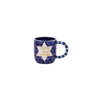 The season for celebrating with latkes & cozy drinks is here, & this mug makes a great companion for cold winter nights. Featuring a deep blue glossy finish, striped handle, & the punny phrase "I love you a latke" written in gold inside a Star of David, this mug is a fun addition to Hanukkah decor.