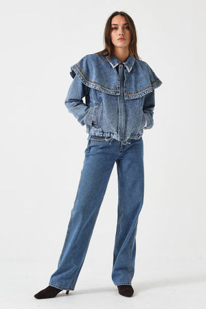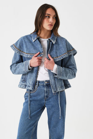 Seventy + Mochi's Fara Jacket is a statement denim piece with a removable cape for endless styling. In a relaxed fit with a drawstring waist and fun embroidery trim details. All seventy + mochi products are crafted with a "Consciously Kind" strategy utilizing recycled and organic fabrics and ethical dying processes.