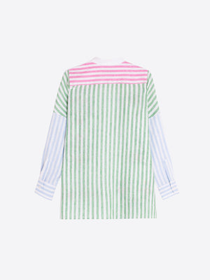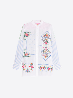 This classic white shirt is embellished with delightful blue, green, pink, and orange embroidery on the front. Featuring a mandarin collar, front button closure, and playfuly striped back and sleeves.