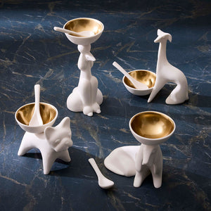 A hand-sculpted homage to one of our favorite pups, this French Bulldog Salt & Pepper Cellar from Jonathan Adler is a charming spot for your favorite seasoning. Featuring our sculptural frenchie form crafted from matte porcelain with a glimmering gold bowl. Sold individually with a single matte porcelain spoon.