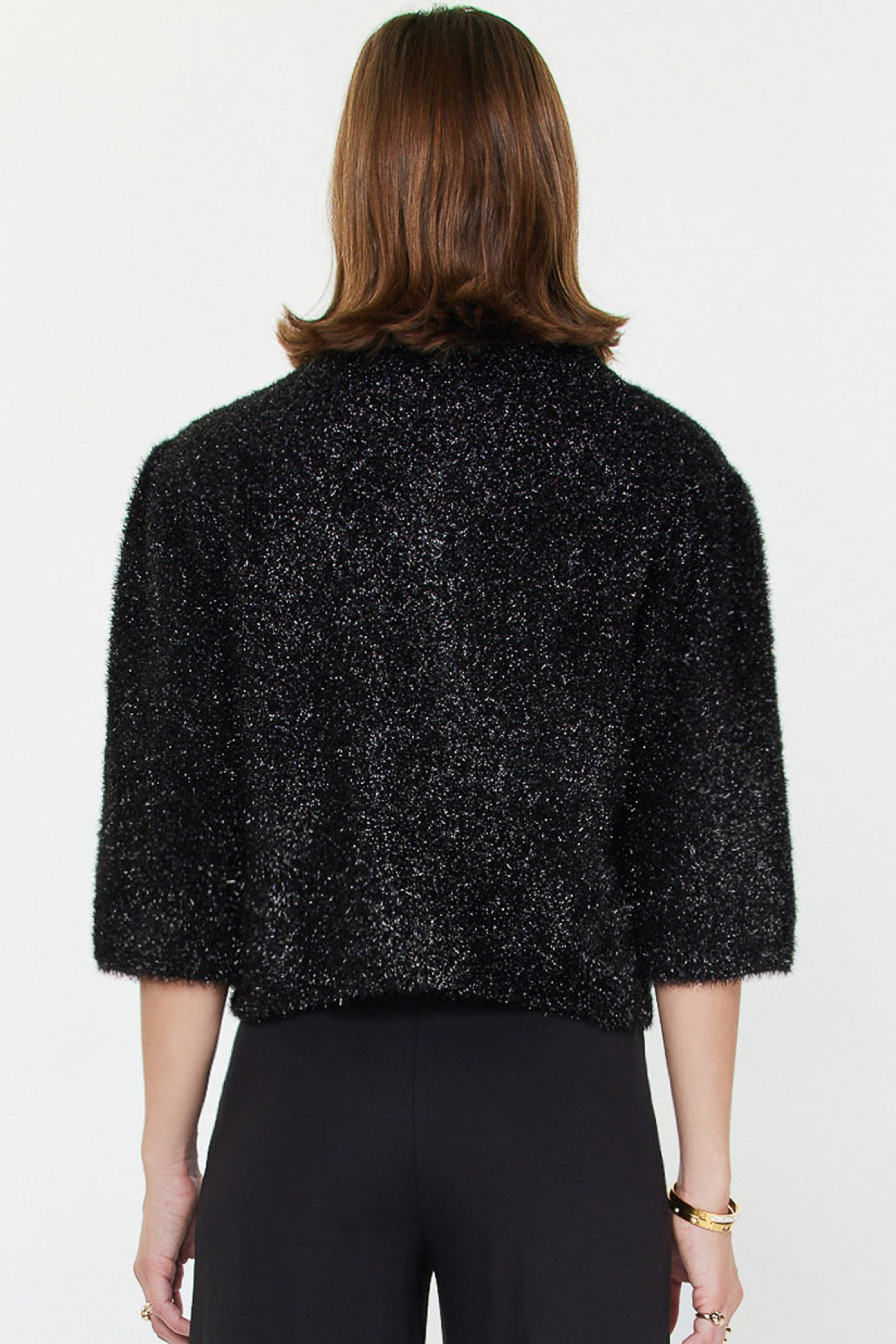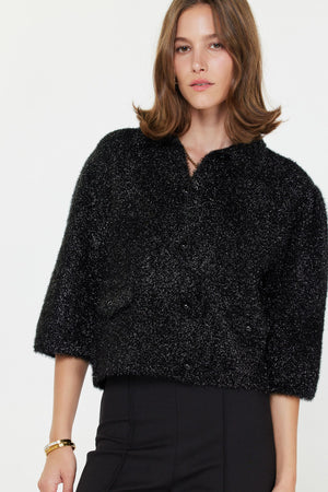 The Fuzzy Metallic Jacket from Current Air showcases a shimmering knit texture paired with a classic collared neckline and front button closure. Its 3/4 length sleeves and flap pockets with button accents add refined detail, while the cropped silhouette offers a contemporary edge for versatile layering and styling.