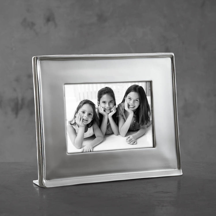 A stunning statement. The Jason silver frame of polished metal enhances your favorite 5x7 horizontal photo, and looks brilliant when displayed on the mantle, desk, or shelf. The footed, self-standing frame makes a fine wedding gift--or for any special occasion--and is an elegant solution whenever a silver frame is called for. Sandcast and hand polished, the frame is made of an FDA safe, easy-care aluminum alloy. Tarnish free.