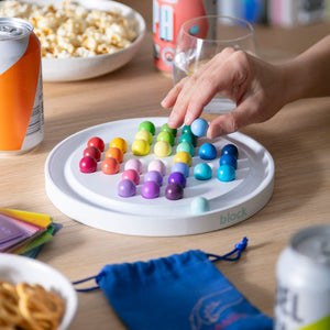 As the game rolls out, enjoy watching how the colors interact and relate to each other. Each balls fits neatly into the central grid, with an indented border circling the base for the wooden balls not in play.
