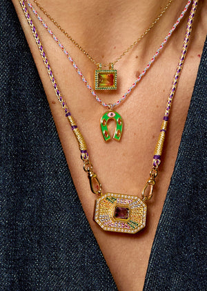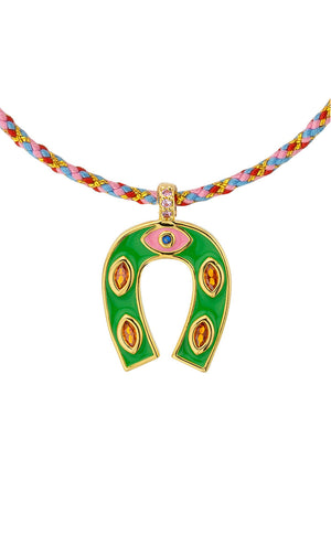 The GREEN MINI HORSESHOE necklace by MYA—BAY is gilded with 24-carat recycled fine gold . Its small horseshoe-shaped pendant is colored with a bright green enamel—a symbol of luck, success, and positive energy. Mounted on a cord, it measures 39 cm + 5 cm of extra chain for an adjustable and lightweight fit.
