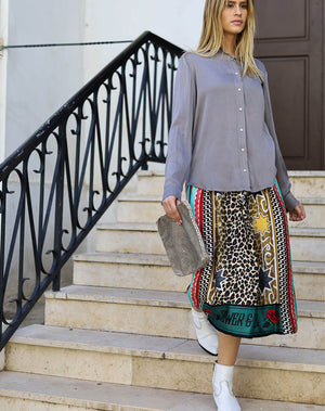 Stand out in this striking new skirt from ME369. Featuring a bold mixture of colors and patterns, this shiny, silky, skirt is bold in style and breezy in it's silhouette.