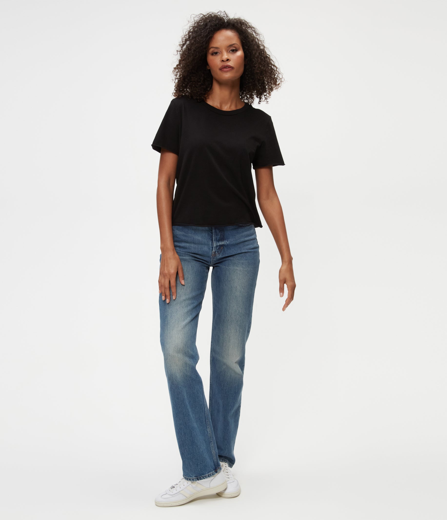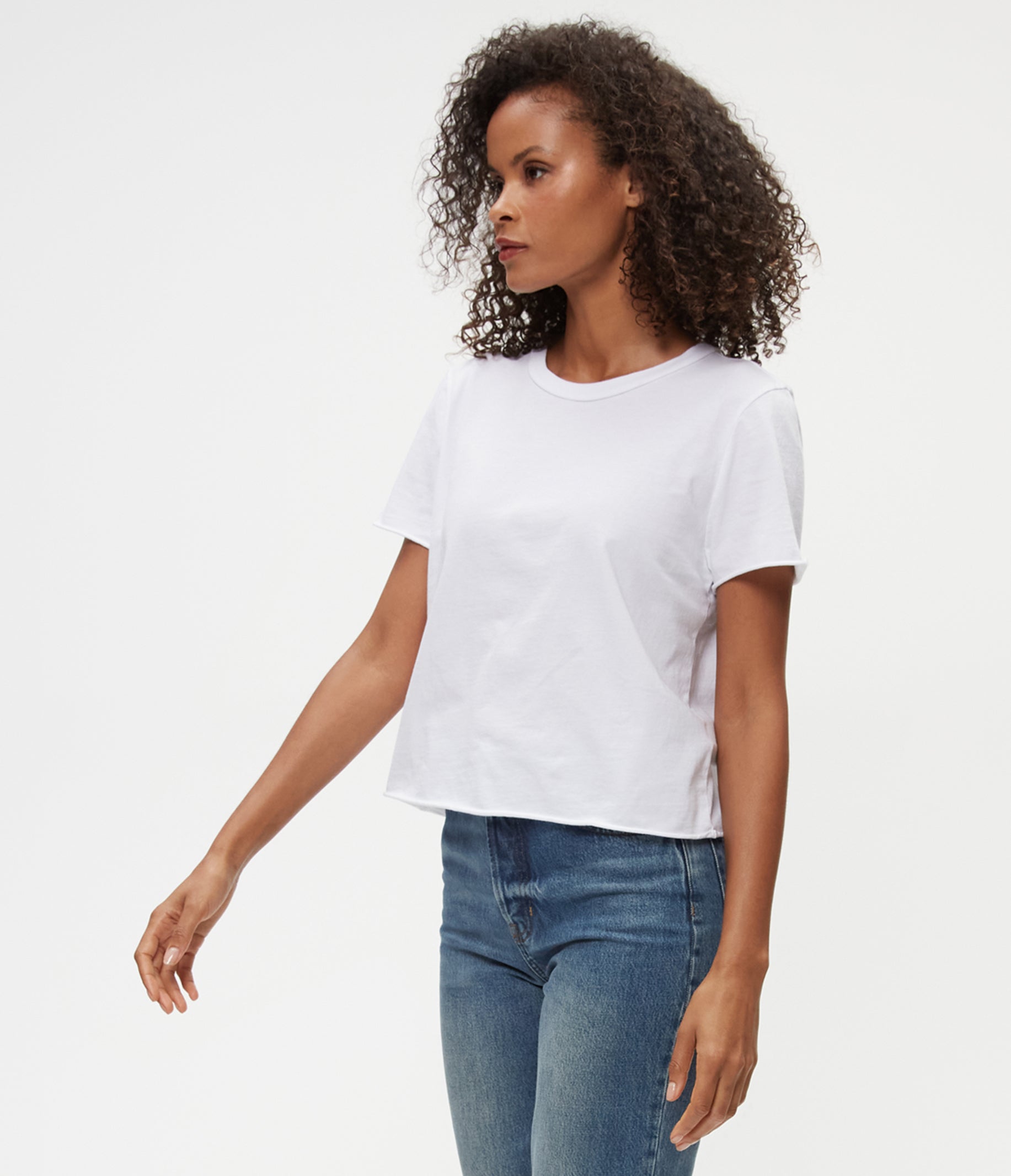 The cropped version of the Becca Tee, Jackie is a short sleeved, easy fitting crewneck with rolled hems at the sleeves and bottom hem. A tee that’s made in LA and made to last.