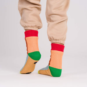 These unisex fleece-lined knit slipper socks are the best of both worlds! The easy fit of socks meets the plush comfort of house slippers. Bold and bright colorblocking will keep you cozy (and bright) indoors. Fully lined with fluffy faux fleece. Non-slip patches on sole. Washable.