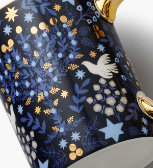 Illustrated doves, laurels, and glowing candles decorate this porcelain Hanukkah mug, accented by a polished gold handle and rim.