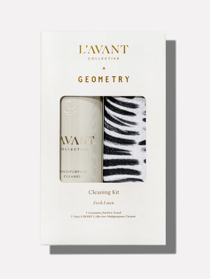 This luxury cleaning kit set features a custom-designed Geometry kitchen towel, crafted to complement L’AVANT’s Fresh Linen Multipurpose Surface Cleaner. Blending luxury, sustainability, and function, this collaboration delivers high-performance cleaning essentials with effortless beauty—because every detail matters.