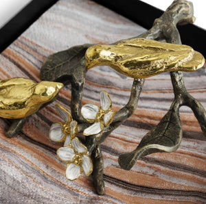 The Lovebirds Cocktail Napkin Holder is hand forged with delicate lovebirds on a Tree of Life-inspired branch, accented with white four-petaled flowers symbolizing unity and innocence.