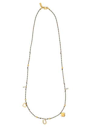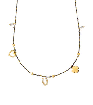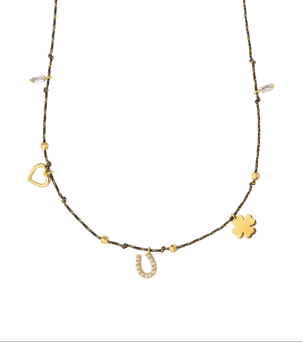 This necklace on its black cord combines luck, love, and good vibes in an ultra-stylish design. A touch of positive energy to slip around your neck to affirm your mood.