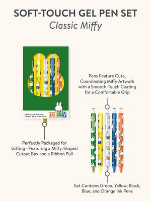 Brighten up your desk and let your creativity flow with this adorable Soft-Touch Gel Pen Set! Packed with five smooth-writing, multicolor gel pens, each one features sweet Miffy artwork and a soft-touch coating for an extra comfy grip. The pens come in a charming die-cut box with a slide-out tray and a playful ribbon pull, complete with a Miffy-shaped cutout for an irresistibly cute display. Whether you're jotting notes, doodling, or gifting to a friend, this set adds a splash of fun and color to every page!