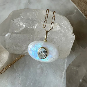 Allow yourself to be mesmerized by this angelic beauty from Robindira Unsworth. On a gold vermeil paperlink chain sits an oval moonstone, inlayed with a light blue topaz accent. The topaz is set vertically, which contrasts against the oval moonstone which is set horizontally. You'll love this one of a kind dichotic beauty!