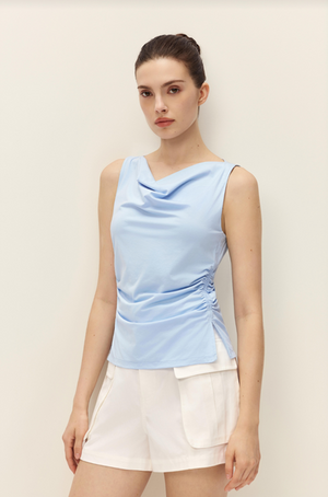 Structured and stylish, you'll love the light blue color of this new top from Elodie. Worn either dressed up or down, this is the perfect Spring shirt! Enjoy a cowl neckline with elegant side ruching and flared hem.