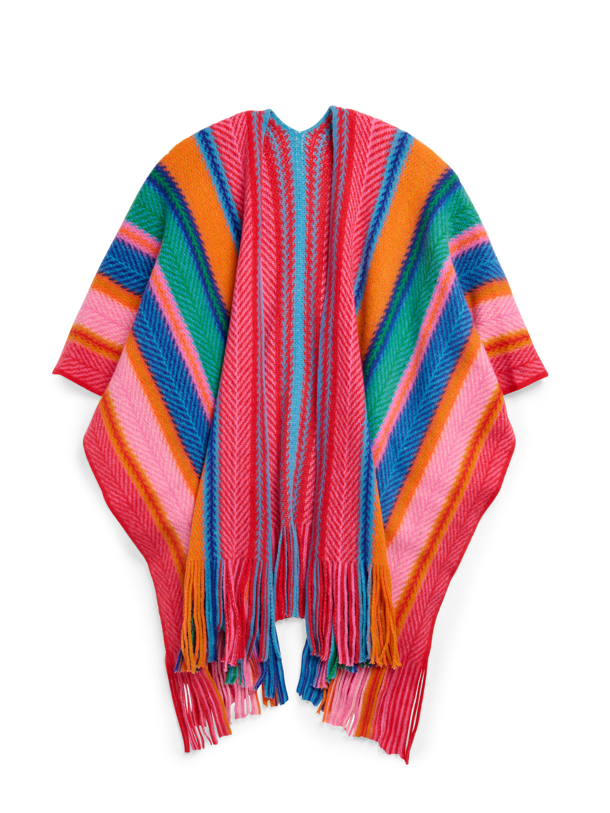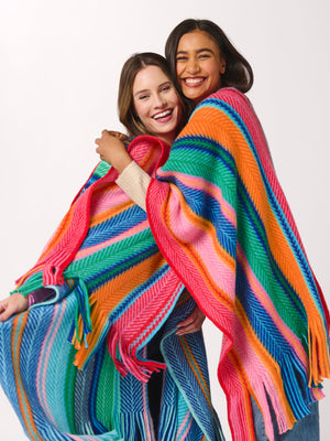Meet the Nicola Cape – your new go-to for adding bold personality to chilly days. With its vibrant, chevron-inspired stripes and playful fringe trim, this cozy layering piece brings color and movement to any outfit. Designed with an easy, open-front silhouette, it drapes effortlessly over sweaters, tees, or even lightweight jackets. Whether you're heading out or staying in, this cape delivers major cozy vibes with standout style.