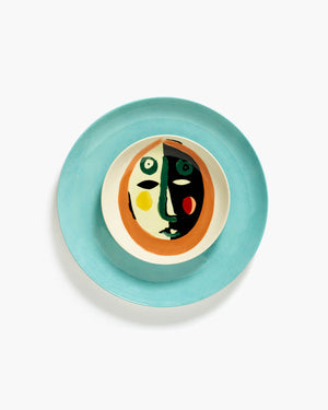 Luxurious earthenware desert plate set with a semi-glaze finish and an abstract face designed by artist Ivo Bisignano.