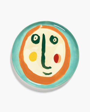 Earthenware serving dish in turquoise with a painting of a face in orange and green.