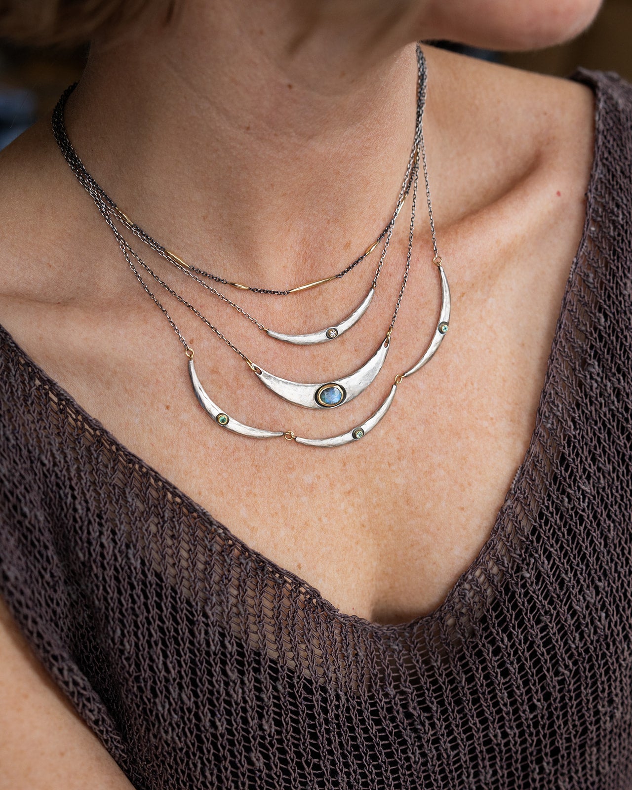 Slim and simple, this necklace from Austin Titus is made from textured oxidized sterling silver with 18k gold accents and a bright 2mm diamond (lab grown). This is a great layering piece or for wearing alone.