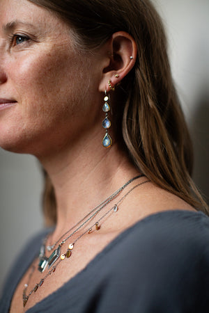 These handcrafted drop earrings feature rose cut stones set in oxidized silver, accented with our signature fused 24k gold setting. Measuring approximately 2 inches in length, they offer a lightweight and vibrant design. The stones alternate between a harmonious blend of moonstone, light blue, and dark blue kyanite for a captivating "shades of blues" palette. Each pair is made to order, ensuring a unique and expertly crafted accessory.