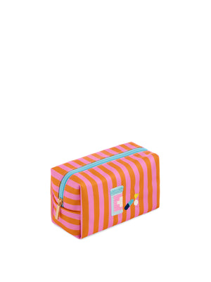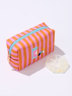 The Pills Small Zip Pouch packs major personality into a compact design. Featuring a playful orange and pink striped pattern and embroidered pill bottle and capsule details, this pouch adds instant fun to your essentials. Its bright aqua zipper pops against the bold print, keeping everything secure with a top zip closure. Perfect for tossing into your tote, it's ideal for cosmetics, vitamins, or tiny must-haves.