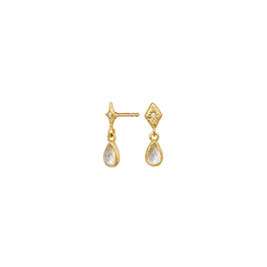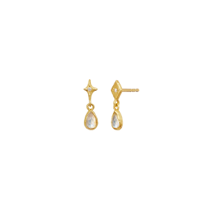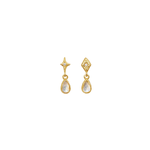 Channel inner growth and new beginnings with the Poco Earrings from Maanesten- a small but magnificent pair. Shimmering rainbow moonstone drops dangle below a shining starburst and diamond.
