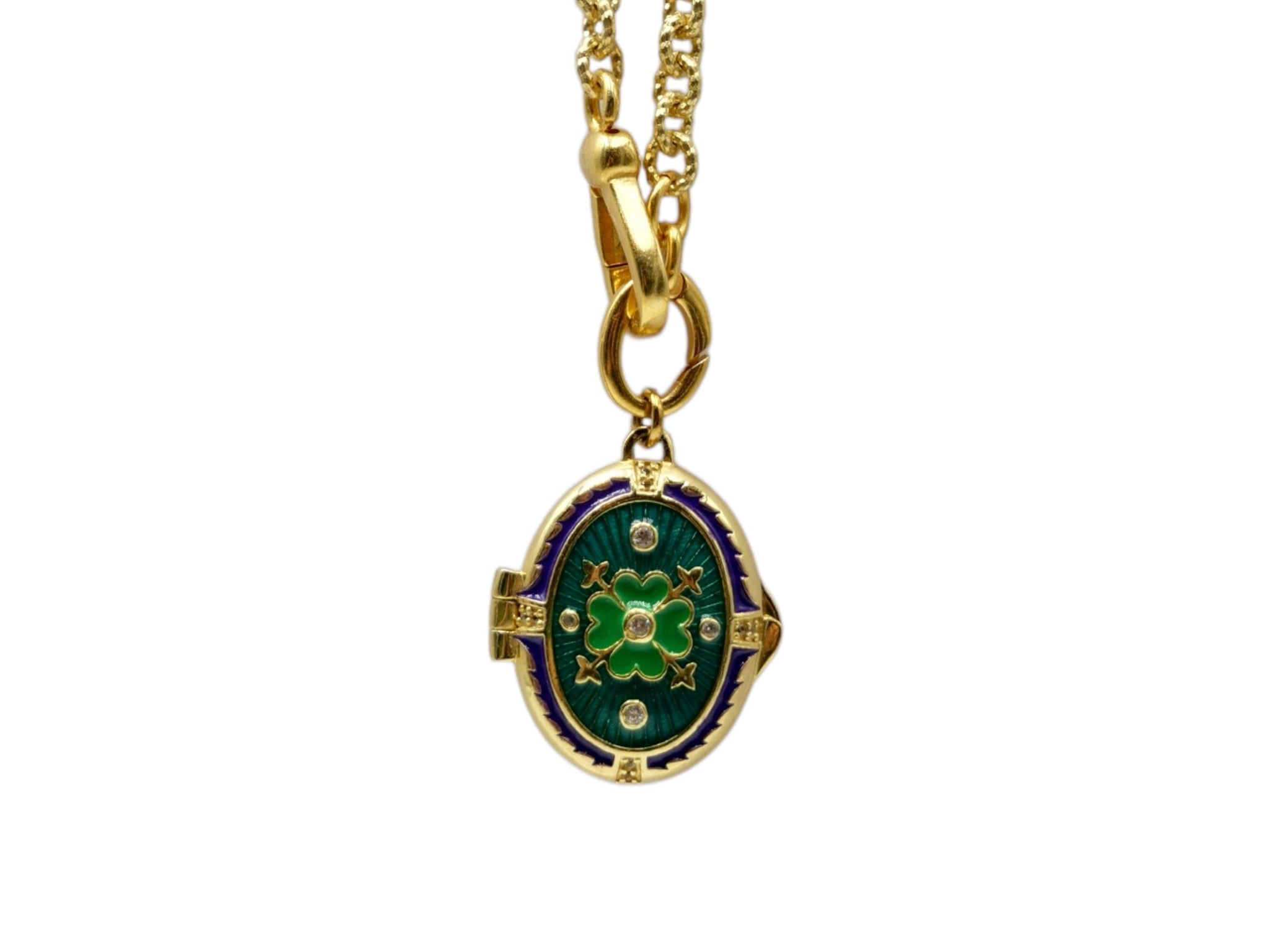Keep your most precious people close to your heart with this locket from Diaperis. It's beautiful blue enamel base is contrasted by a green enamel clover a the center, scattered with sparkling zircons. A long chunky chain ensures effortless style!