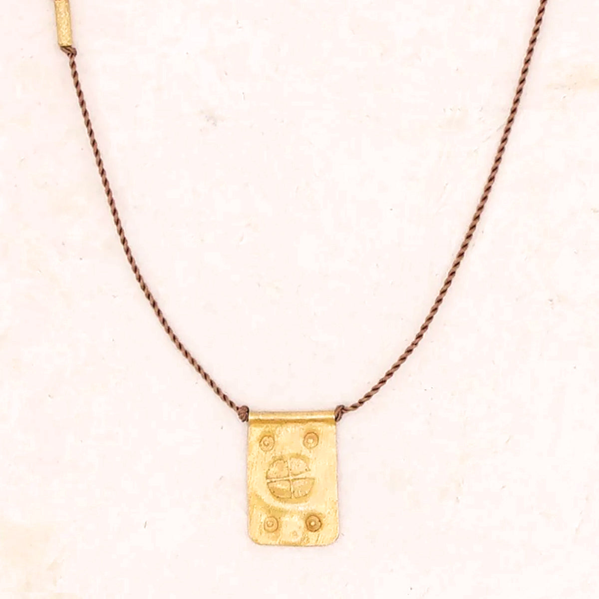 Rectangle talisman is handmade silver, covered in 24 karat gold. Taupe nylon, asymmetrical bead detail, pearl flower button closure. Rectangle measures 3/8 x 5/8" Necklace length 16"