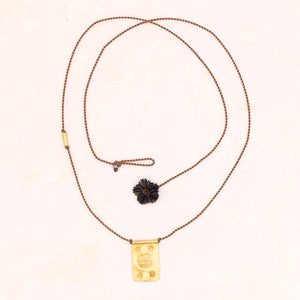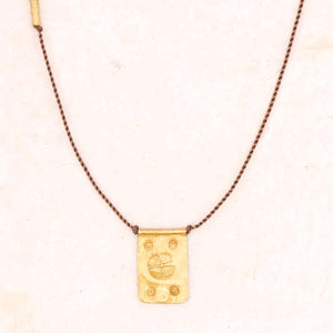 Born from a long standing partnership with two Turkish artists, each piece is hand-stamped with antique imagery. A symbol of world citizenry to be worn for personal protection and happy travels. Meant to gently form a time worn patina, as a relic. Strung on durable nylon cord with a mother of pearl flower button closure.