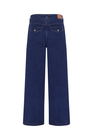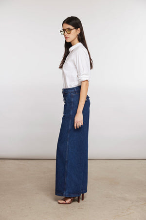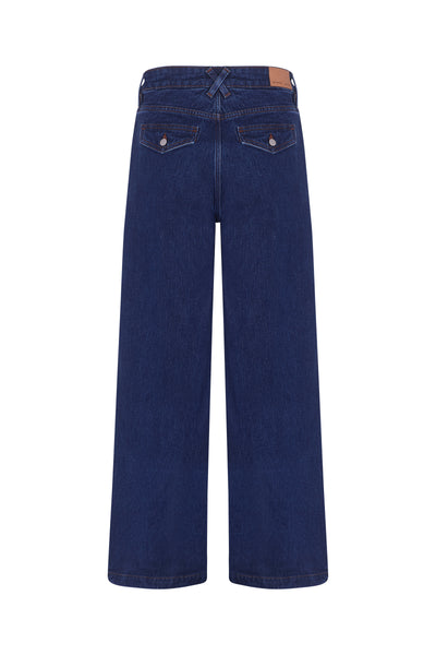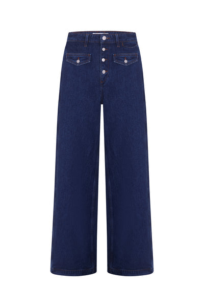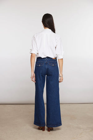 Seventy + Mochi's newest must have wide leg jeans feature retro pockets for a vintage vibe. The wide leg silhouette pairs with heels and sneakers alike.