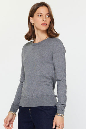 The Scallop Detail Sweater from Current Air features ribbed cuffs with a beautiful trim detail. A soft classic knit with with floral embroidery stitching at the hem and sleeves. Great for layering, wear it with trousers for work or keep it casual with your favorite jeans.