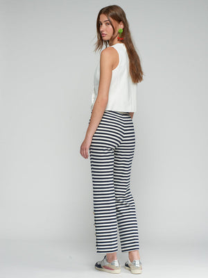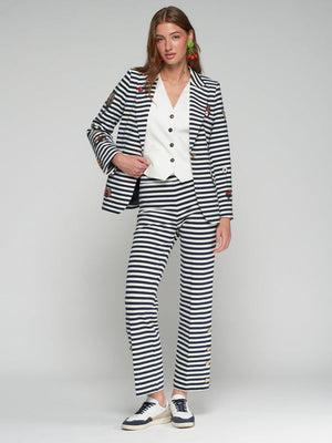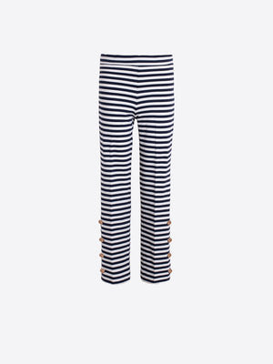 These Vilagallo trousers feature a nautical horizontal stripe print in navy blue and white. Straight cut with decorative gold button detailing on the side of the hems. Pair with a tshirt or blouse and add the matching blazer to complete the look.