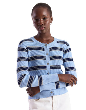 Add some sparkle to your stripes with this ribbed cardi from Wispr. In it's soft fabric, this classic stripe pattern is elevated by a subtle sparkle design and beautiful molten buttons.
