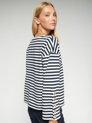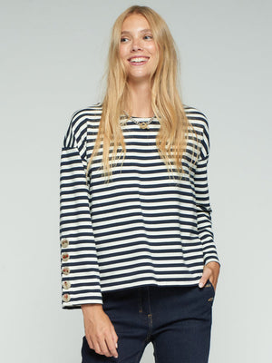 The fabulously flared sleeves on this tee are adorned with Vilagallo's signature buttons in a summertime theme. Playfully polished in a crisp nautical stripe, this is sure to be a go to with everything from jeans to white trousers.