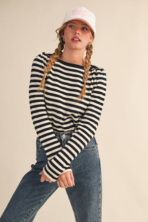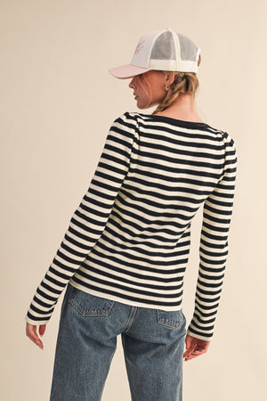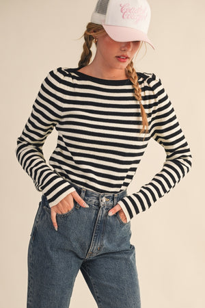 This sweater from &Merci is a timeless treasure! The classic black and white stripe pattern is elevated by an elegant boat neckline. Stay comfy, cozy, and cool in the spring sweater.