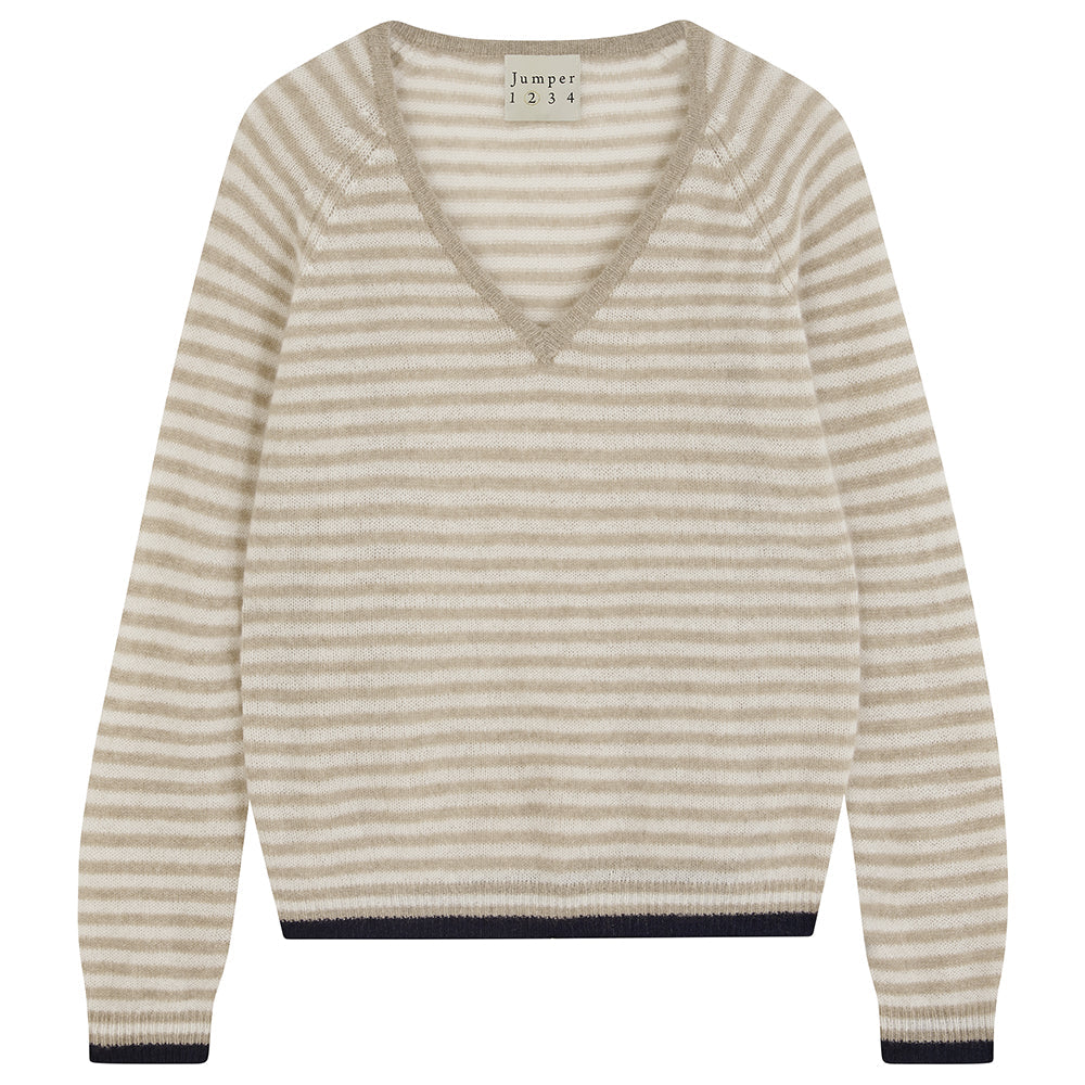 This Jumper 1234 cashmere sweater is a lightweight addition to your spring sweater wardrobe. With a vee neck and stripes in a light brown and cream with contrasting navy ribs at the cuffs and hem. It's got an oversized fit to layer with all of your spring favorites.