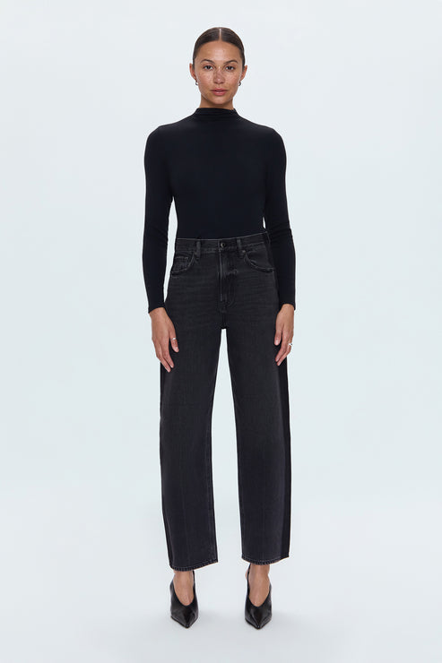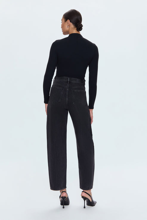 A best-selling silhouette, the Wes offers a flattering high rise and full-length 30" inseam in a stylish barrel leg that delivers sophisticated drama. Clean hems and a tuxedo stripe detail refine the shape, while premium rigid non-stretch denim in Cinema, a rich black wash, adds effortless polish and versatility.