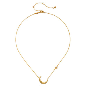 This 18kt gold plated necklace shines with a crescent moon, symbol of the goddess, nourishment, and protection. A single star twinkles on the delicate chain, signifying guidance, creativity, and dreams. Wear this necklace to tap into your intuition, and to ignite the powerful feminine energy within.