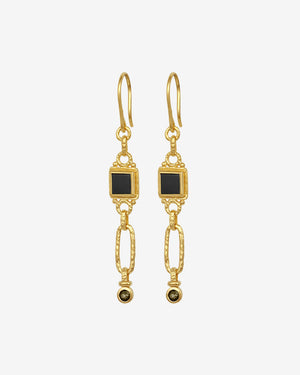 Darkly opulent, these 18k gold vermeil statement earrings embody transformation and resilience. A bezel-set onyx tile holds space, supporting a swaying drop accented with smoky quartz. Interplaying textures and tones craft an alluring talisman.
