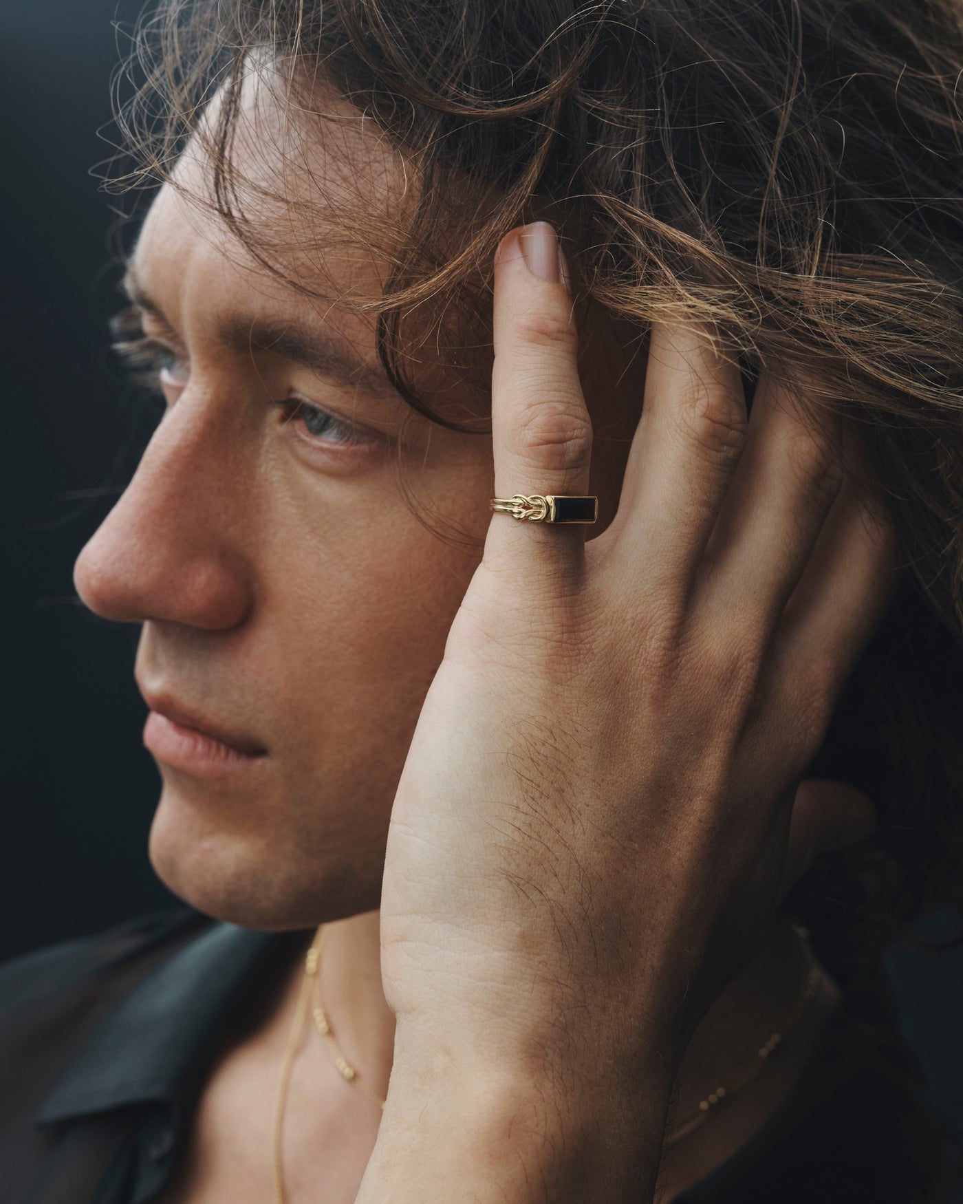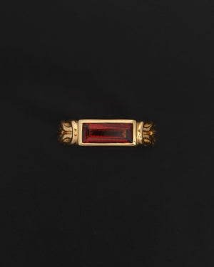 The Airla Ring is a solitaire design featuring an east-west set baguette-cut garnet. The 18k gold vermeil band is formed by two cord-like strands, joined at the shoulders with love knots. Inspired by ancient tradition, the Herakles knots symbolize eternal love and enduring connection, their continuous loops echoing the rhythms and cycles of life.