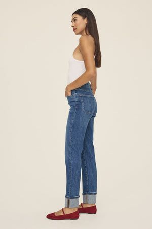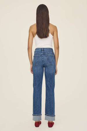 Westwood is a true, mid-indigo wash with authentic fading and vintage character throughout. It features a silver shank, copper rivets, khaki stitching and an adjustable cuff at the clean hem.